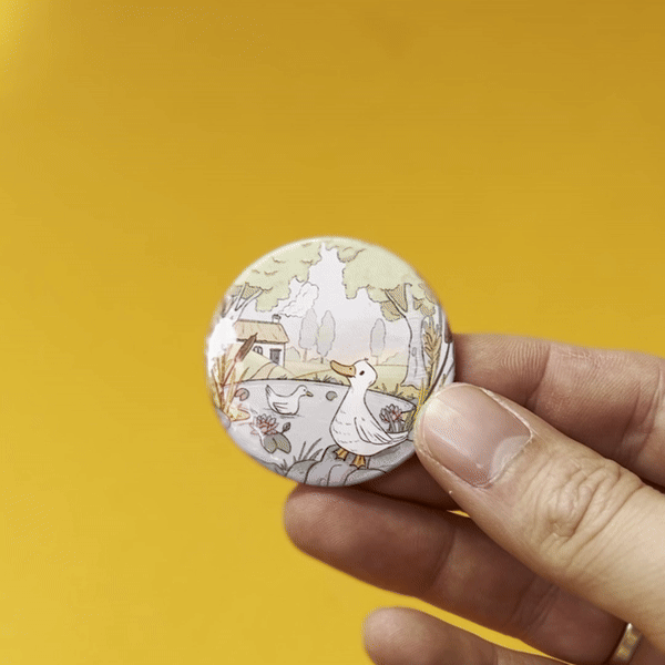 A 45mm button with metal backing, perfect to pin on your bag, jacket, or wherever you like!