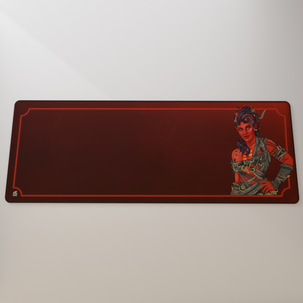 A large gaming deskmat with stitching and anti slip rubber surface.